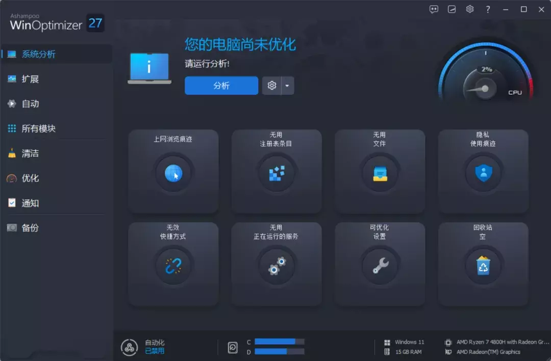 包含的功能有:系统状态分析、扩展分析、系统清理、系统优化、硬件检测等多种功能。