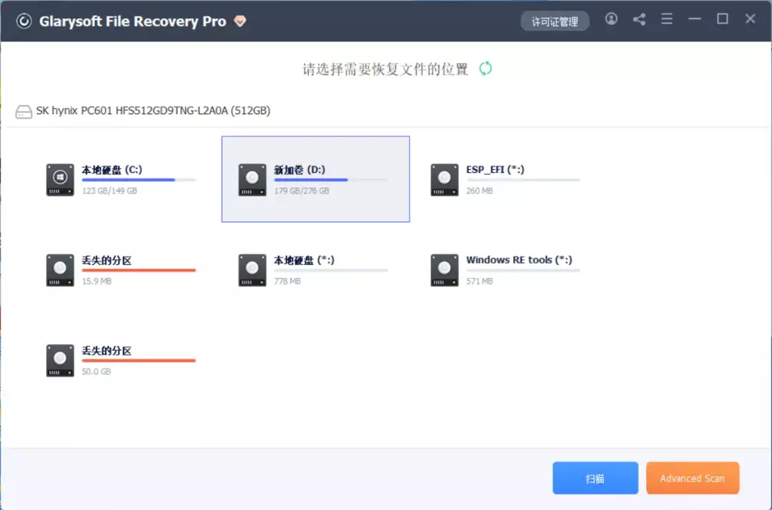 恢复方式很简单,先选择需要恢复的分区,然后进行扫描或者高级扫描,高级扫描所需要的时间更长,但是可以扫描到更多隐藏的文件。