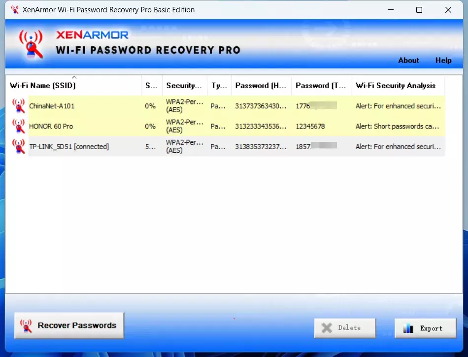 这款 XenArmor WiFi Password Recovery 可以一键查看系统保存的各种 WiFi 密码。