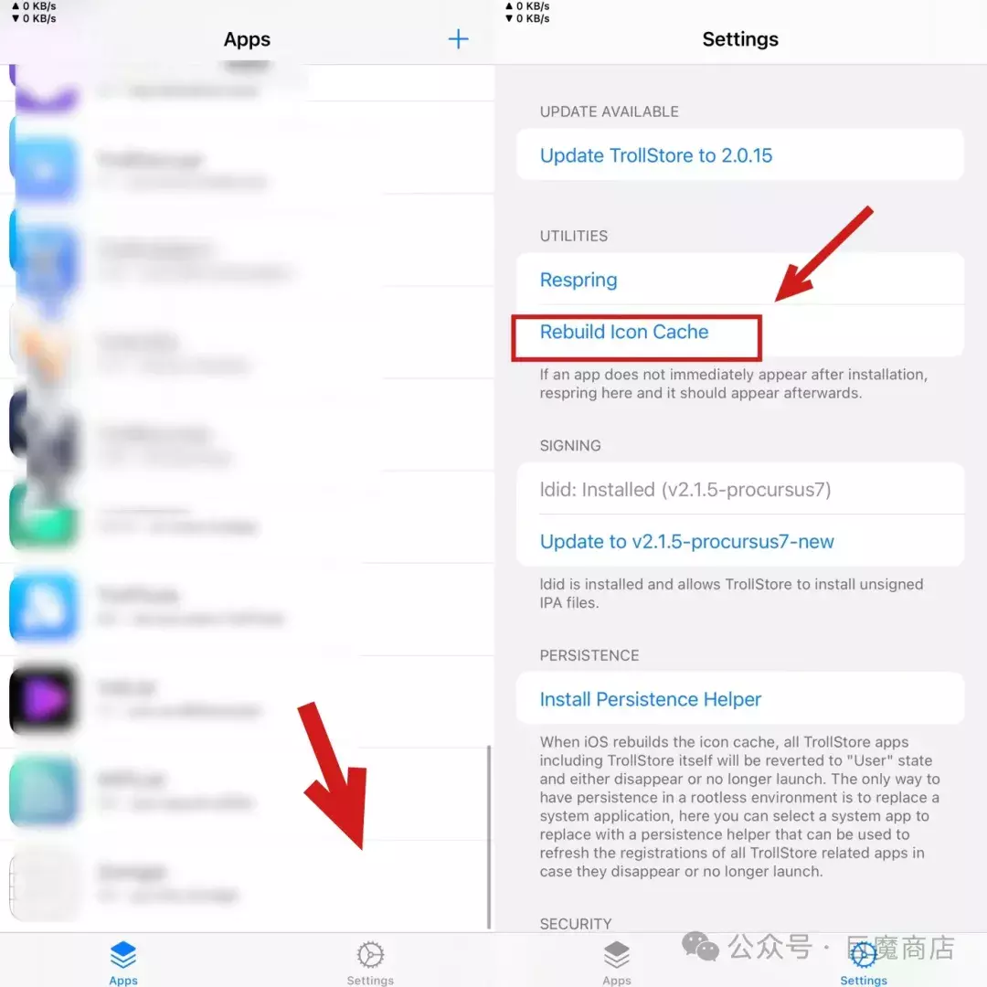 截屏好了以后把TrollStore 巨魔商店打开,点击右下角设置,再点击Rebuild Icon Cache 重建缓存图标,稍等一会儿手机会注销,注销成功进入手机桌面,手机上白图标的应用会全部没了。这个时候你也不用担心资料没了,聊天记录没了,放心他们都在,你只需要打开你的苹果应用商店,重新再把它们挨个下载回来即可。下载好了,打开它什么都在。以上就是我发现的问题,以及解决方法,欢迎大家在留言区讨论。