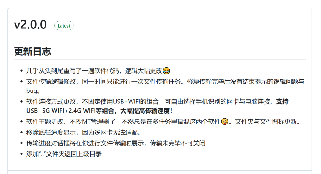 而最近,这个工具升级到了2.0版本,拥有更多特性,作者还重写了代码,修改了第一版里面仿造MT管理器的文件传输设计。