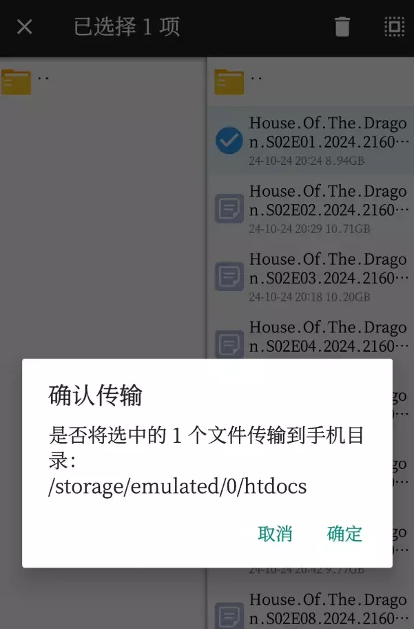 它的操作方式是先要长按选择好需要传输的文件,在选好的任意文件上再次长按,才会弹出传输窗口,这个需要注意一下,因为第一次使用的话,选择之后没有任何操作按钮,可能会有点懵。