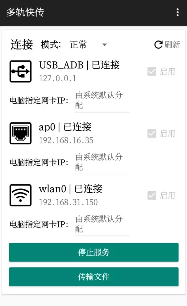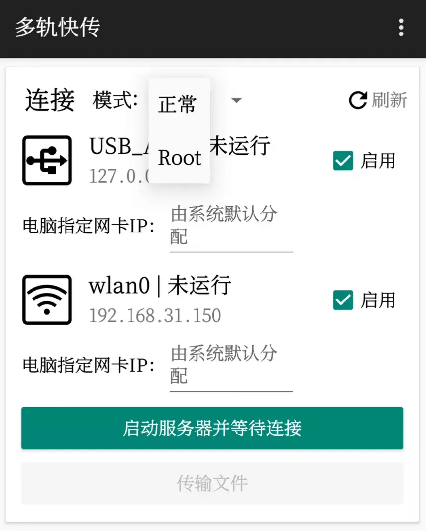 手机端的在连接前可以修改的选项比较少,模式里有一个ROOT模式和正常模式,ROOT之后可以访问更多系统级别的文件,平常传文件并不影响,选正常模式即可。