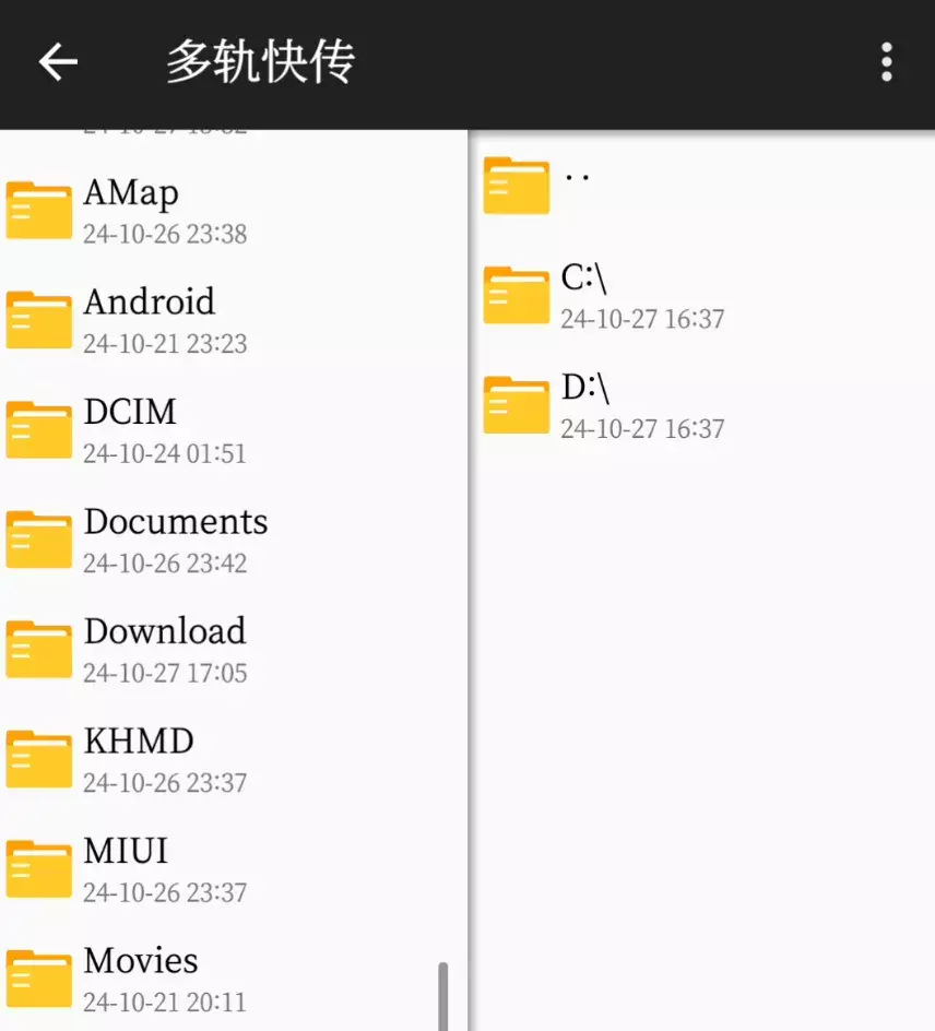 在相同的网络环境下,多轨快传还可以连接上手机数据线,来一起传输。连接成功之后的界面如下:
