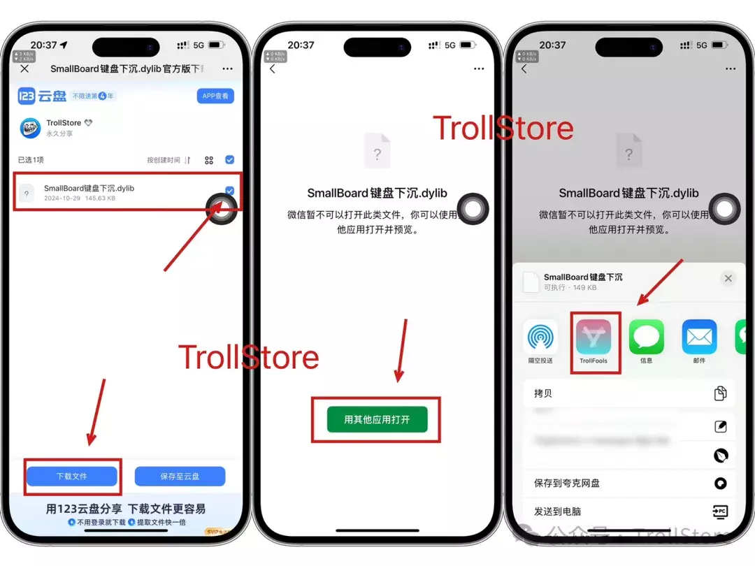 文末获取SmallBoard 下载地址以后,直接在微信里面访问,找到SmallBoard 勾选一下,然后点击下载文件。稍等一会儿点击确定,再点击用其他应用打开。选择用TrollFools 打开。