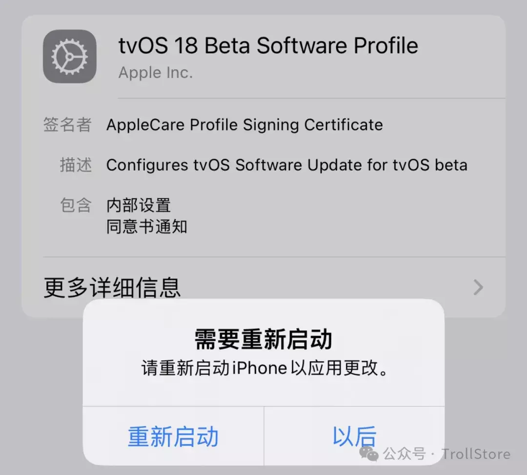 tvOS 18 屏蔽描述文件已出,不需要修改日期直接安装,屏蔽以后不会显示更新系统,也不会有小红点显示,详情参考上图。