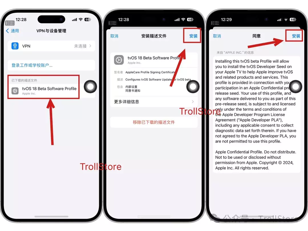 接着返回桌面,打开设置,通用,设备管理,点击描述文件 tvOS 18 Beta Software Profile ,再点击右上角安装,再点击安装。