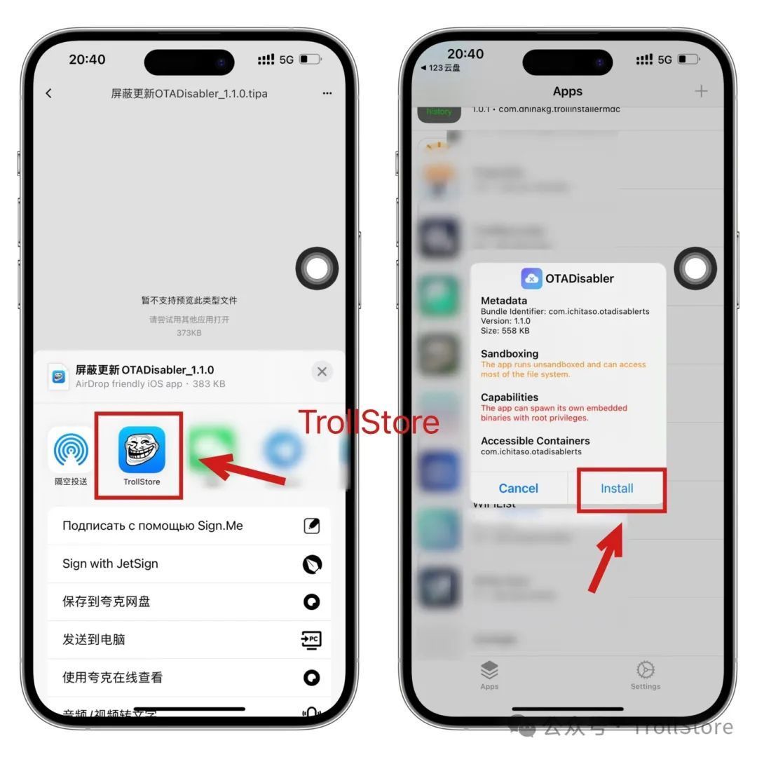 OTADisabler 这款工具使用非常简单,文末下载好OTADisabler以后分享给TrollStore 安装即可。