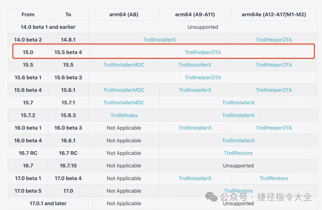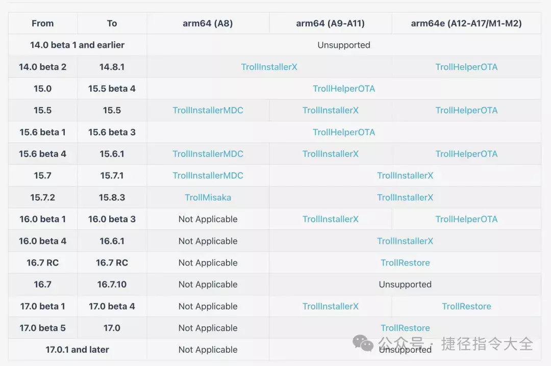 TrollStore安装方法,官方文档也给了详细的表格文档,对应的系统版本范围和芯片,对应的安装方法都有.