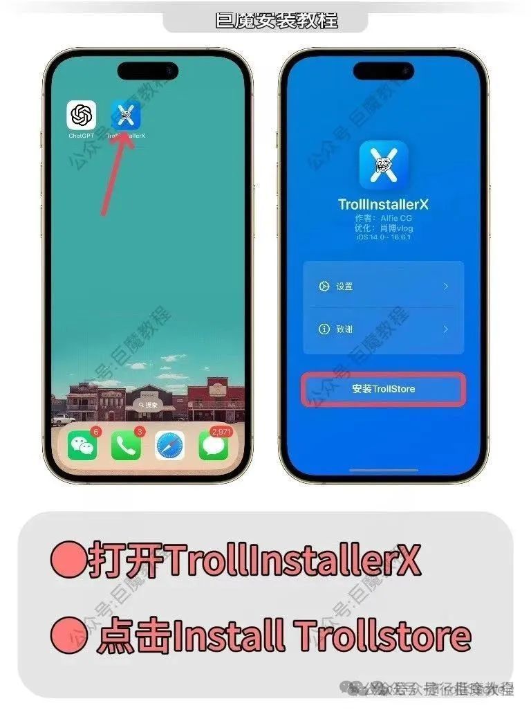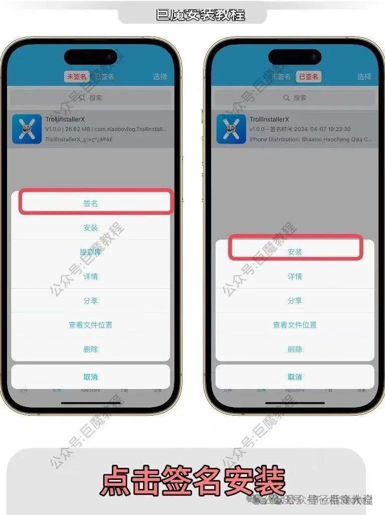 TrollInstaller X首先用证书或者ID签名安装到手机上,ID签名有牛蛙助手nb助手,需要用到电脑.证书签名用轻松签全能签之类的工具签名安装好.