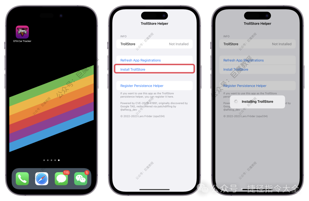 2.打开GTA Car Tracker,会自动变成紫色的安装器.点击Install TrollStore.