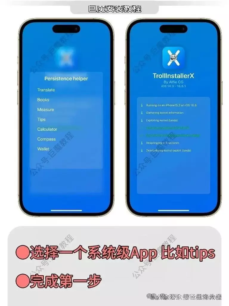 如果提示红字,建议先重启一下手机重新引导,如果出现如下面左图一样的提示,这个意思是让的巨魔持久性助手注入到哪个app,一般都是系统级的软件,选择一个没用的,比如提示app,也就是tips,选择注入.当然你也可以选择其他的app注入.