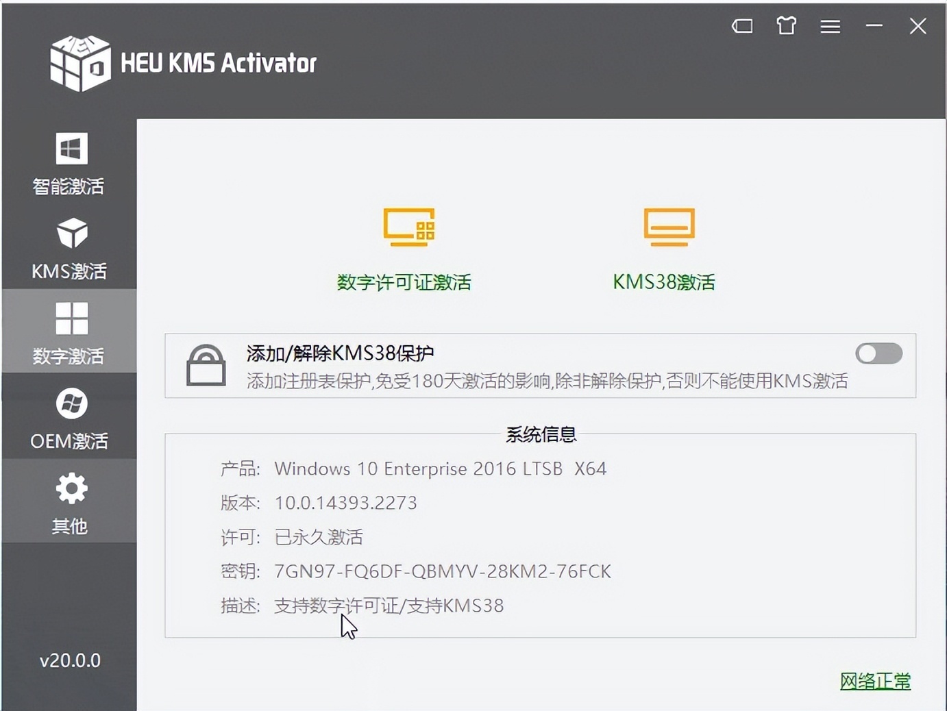 并非所有系统都可以使用数字激活,在系统信息栏“描述”中显示了当前系 统是否支持。 添加/解除 KMS38 保护:点击右侧开关,“开”表示安装、“关”表示卸载, 选择后,点击左侧按钮即可执行。