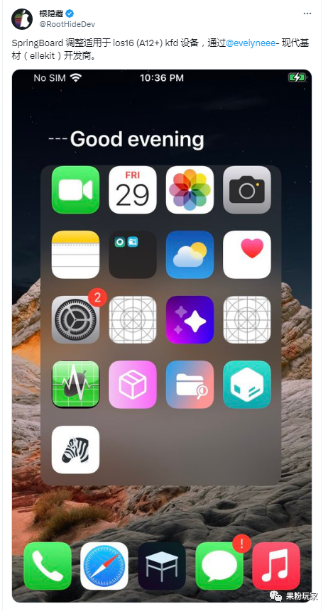 随后 @RootHideDev 也发文确认,SpringBoard 调整适用于 iOS 16 (A12+) KFD设备。并晒图佐证,DOCK栏 5 个图标….